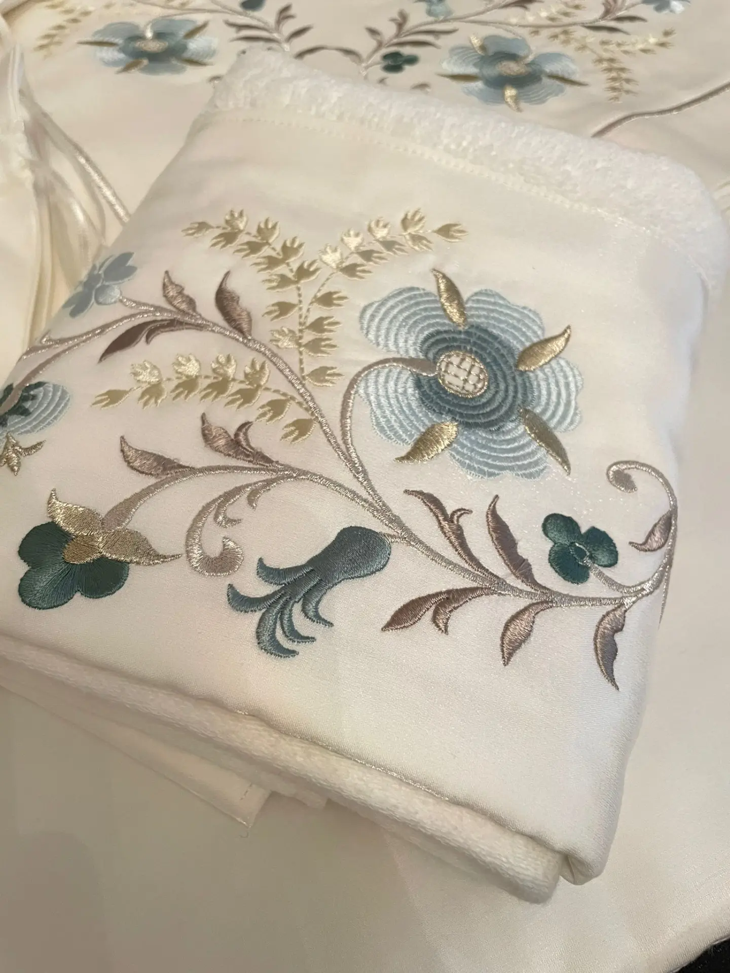 Ekru Üzerine Turkuaz Yeşil Nakış İşleme Bohça Seti